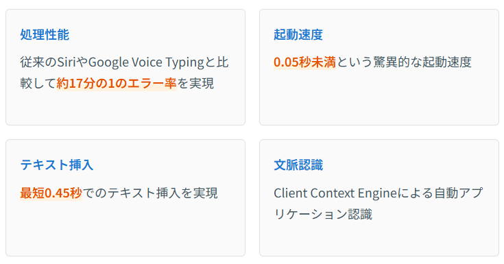 「Client Context Engine」という独自技術により、使用しているアプリケーションを自動認識し、文脈に応じた最適なテキストフォーマットを提供します。例えば、Obsidianで作業中はMarkdown形式に自動変換し、Slackではカジュアルな短文スタイルに調整するなど、状況に応じた柔軟な対応が可能です。