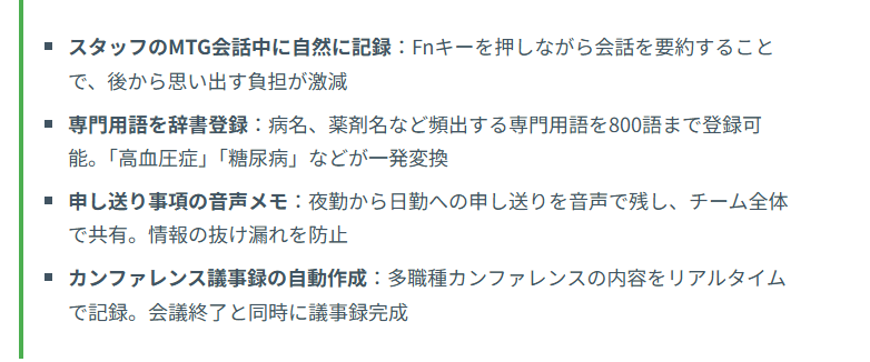 - 会議議事録作成:リアルタイム化により、会議後作業時間をゼロに