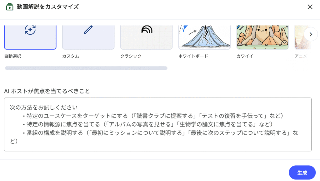 この指示を加えるだけで、AIは内容、ナレーションの口調、ビジュアルのテイストを自動で調整してくれます。