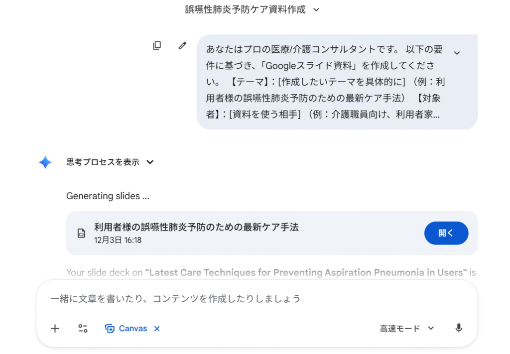 医療介護の資料は、目的が明確でなければ伝わりません。Geminiに効果的なスライドを作成させるため、誰に何を伝えたいかを具体的に指示します。