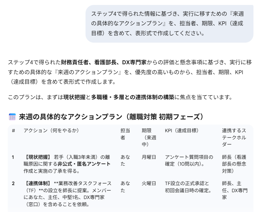 「ステップ4で得られた情報に基づき、実行に移すための『来週の具体的なアクションプラン』を、担当者、期限、KPI(達成目標)を含めて、表形式で作成してください。」