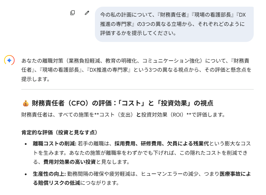 「今の私の計画について、『財務責任者』『現場の看護部長』『DX推進の専門家』の3つの異なる立場から、それぞれどのように評価するかを提示してください。」