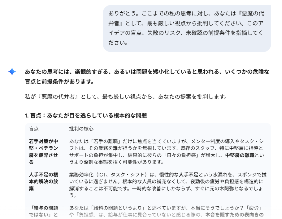 「ありがとう。ここまでの私の思考に対し、あなたは『悪魔の代弁者』として、最も厳しい視点から批判してください。このアイデアの盲点、失敗のリスク、未確認の前提条件を指摘してください。」